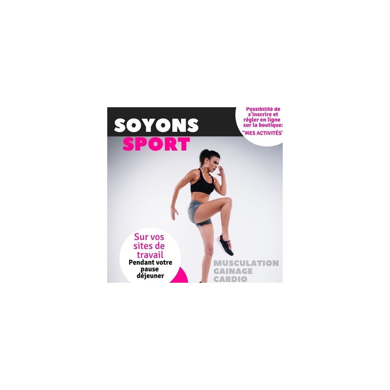 Rejoignez nos cours "Soyons Sport » pendant la pause méridienne et profitez d'un moment de bien-être. En seulement 45 minutes, dynamisez votre journée avec des exercices adaptés à tous les niveaux. C'est l'occasion parfaite pour évacuer le stress, améliorer votre forme physique et revenir au travail plein d'énergie !